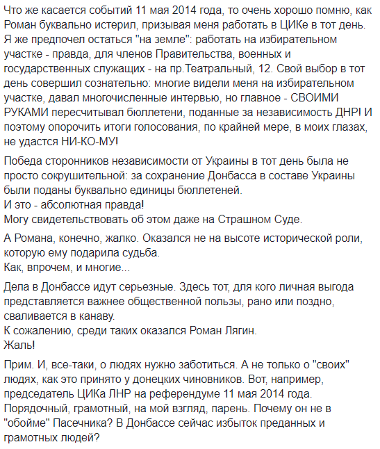 "Во время конфликта (по линии Ходаковский-Захарченко - ред.) Лягин грозился рассказать прессе какие-то непорядочные, на его взгляд, подробности выборного процесса в "ДНР", и это было расценено властями "ДНР" как попытка нанесение ущерба республике в условиях военного времени", - писал сторонник сепаратистов, волонтер Александр Жучковский. Кроме этого, по его словам, Лягин "перешел на личности", нанеся Захарченко серьезные обиды.