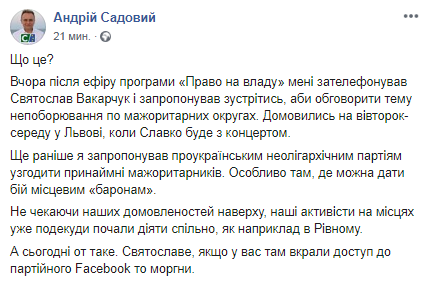 "Вчера после эфира программы "Право на власть" мне позвонил Святослав Вакарчук и предложил встретиться, чтобы обсудить тему непротивостояния по мажоритарным округам. Договорились на вторник-среду во Львове, когда Слава будет с концертом... А сегодня вот такое. Святослав, если у вас там украли доступ к партийному Facebook, то моргни", - написал мэр Львова.