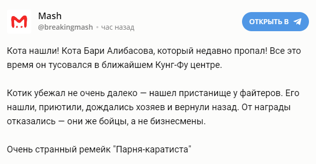 "Кота нашли! Кота Бари Алибасова, который недавно пропал! Все это время он тусовался в ближайшем Кунг-Фу центре. Котик убежал не очень далеко - нашел пристанище у файтеров. Его нашли, приютили, дождались хозяев и вернули назад. От награды отказались - они же бойцы, а не бизнесмены", - говорится в сообщении.