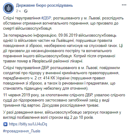 По предварительной информации, военнослужащий одной из воинских частей по неосторожности нажал на спусковой крючок, в результате автомат выстрелил, и сослуживец солдата получил огнестрельное ранение. Раненный умер в Яворовской районной больнице.