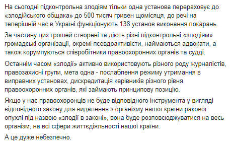 "Сегодня, к сожалению, в каждой области страны есть "положенцы", которые по согласованию с "ворами в законе" в местах лишения свободы выбирают так называемых "смотрящих", деятельность которых, прежде всего, направлена на ослабление режима содержания, по принципу "поддерживаешь воровское движение - живешь комфортно, получаешь "грел" и привилегии", - написала Аброськин в Фейсбук.