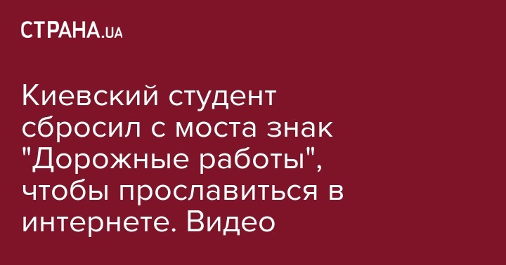 Киевский студент сбросил с моста знак "Дорожные работы", чтобы прославиться в интернете. Видео