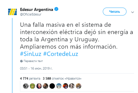 "Масштабный сбой в системе электросвязи оставил Аргентину и Уругвай без электричества. Мы будем обновлять информацию по мере поступления", - говорится в сообщении.