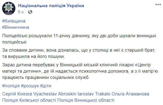 Во вторник, 18 июня, полицейские разыскали 11-летнюю Ангелину Макарову из Винницкой области, которую двое суток искали винницкие полицейские. Об этом говорится в сообщении Нацполиции Украины в Facebook.