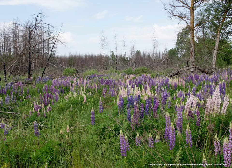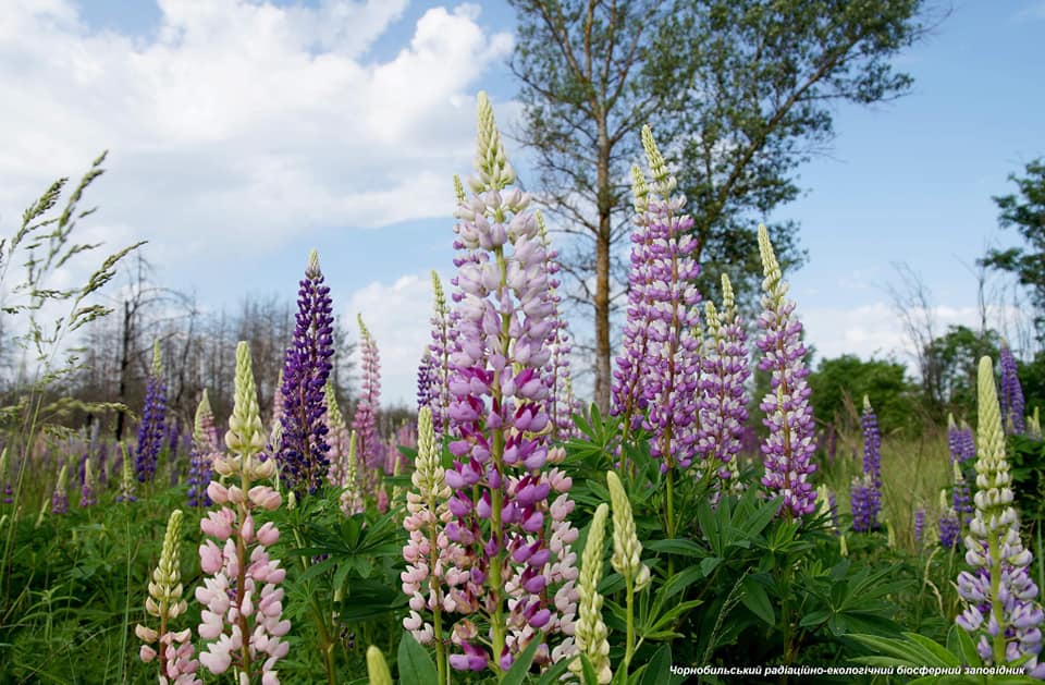 На третьем и четвертом фото - поляна люпина. Это растение семейства бобовых, его еще называют "волчий боб". Интересно, что в цветках люпина содержится около 50% белка, 20% масла, которое по качеству близкое к оливковому. Несмотря на то, что семена люпина с древних времен используется в пищу человеком и на корм животным, данные цветки нельзя использовать из-за произрастания в радиационном фоне.