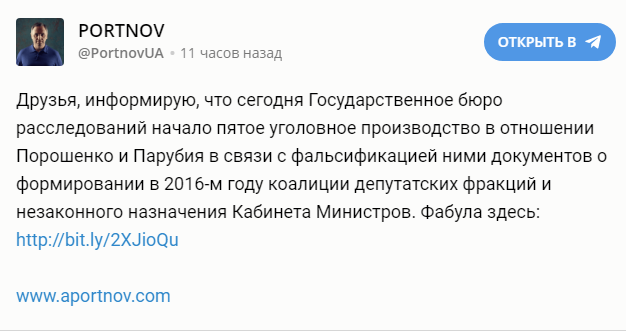 "…Государственное бюро расследований начало пятое уголовное производство в отношении Порошенко и Парубия в связи с фальсификацией ими документов о формировании в 2016-м году коалиции депутатских фракций и незаконного назначения Кабинета Министров", - отметил Портнов.