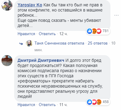 "Инцидент произошел в центре Киева около Бессарабской площади. Вот прислали мне в личку пострадавшие. Сюжет таков: пробка, Бессарабка, патрульные остановили какую-то машину и начали разговаривать с водителем на повышенных тонах. Сзади ехала семья - муж, жена и ребенок. После того, как жена решила снять на видео конфликтную ситуацию, патрульные переключили свое внимание на нее, забыв об остановленном ими ранее авто. Все закончилось задержанием женщины, ее мужа и оставленным на 5 часов в машине ребенком.