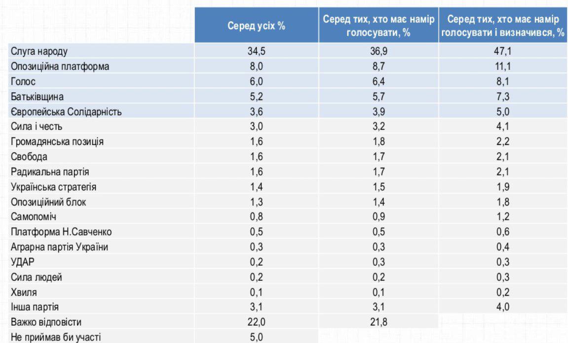 Так, согласно опросу, если бы парламентские выборы проходили в ближайшее воскресенье, за партию "Слуга народа" президента Владимира Зеленского готовы проголосовать 47,1% тех, кто намерен голосовать и определился с симпатиями (34,5% из всех опрошенных). За партию "Оппозиционная платформа – За жизнь" Юрия Бойко – 11,1% определившихся (и 8% из всех опрошенных), за партию "Голос" Святослава Вакарчука - 8,1% респондентов (6% среди всех опрошенных).