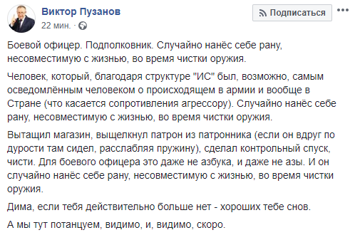 "Час назад, у себя дома, во время чистке наградного пистолета нанёс себе смертельное ранение патриот Украины и мой друг Дмитрий Тымчук.