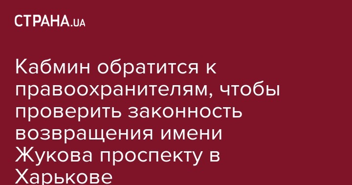 Кабинет министров Украины обратится к правоохранителям, чтобы проверить законность решения Харьковского городского совета от 19 июня о возвращении проспекту Петра Григоренко имени Георгия Жукова. Об этом сообщает "Интерфакс-Украина"