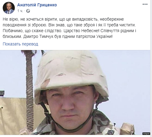 Схожую позицию высказал и лидер партии "Гражданская позиция" Анатолий Гриценко: "Не верю, не хочется верить, что это случайность, неосторожное обращение с оружием. Он знал, что такое оружие и как ее надо чистить. Посмотрим, что скажет следствие", - говорится на его фб-странице.