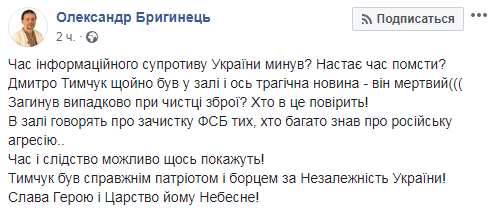Представитель "БПП" Александр Бригинец также заявил, что не верит в случайную смерть Тымчука. "Время информационного противодействия Украине прошло? Наступает время мести? Дмитрий Тимчук только что был в зале и вот трагическая новость - он мертв. Погиб случайно при чистке оружия? Кто в это поверит!", - сказал нардеп. "В зале говорят о зачистке ФСБ тех, кто много знал о российской агрессии. Время и следствие возможно что-то покажут!", - добавил он.