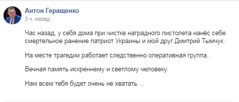Геращенко добавил возможные версии происшествия, хотя до этого писал только о самоубийстве. "Изучаются все возможные версии: убийство, самоубийство, неосторожное обращение с огнестрельным оружием", - дописал Геращенко. Также он добавил фото Тымчука и фразу "настоящему народному депутату".