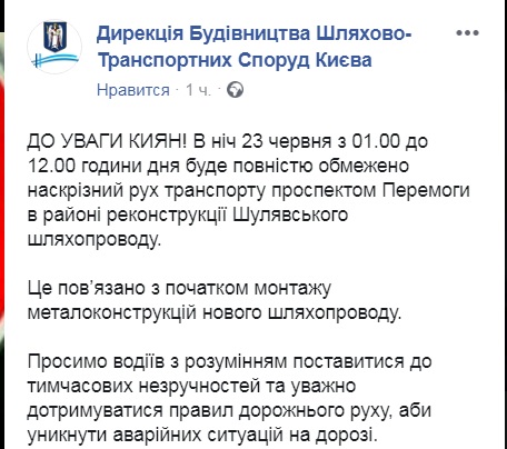 "В ночь 23 июня с 01:00 до 12:00 часов дня будет полностью ограничено сквозное движение транспорта по проспекту Победы в районе реконструкции Шулявского путепровода. Это связано с началом монтажа металлоконструкций нового путепровода", - отмечено в сообщении.
