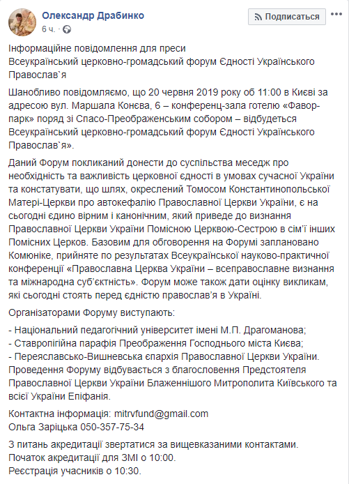 Предстоятель Православной церкви Украины митрополит Киевский и всея Украины Епифаний благословил проведение Всеукраинского церковного-общественного форму единства православных, который состоится в 11:00 в четверг, 20 июня. Однако в это же время состоится "поместный Собор УПЦ Киевского патриархата", который созвал почетный патриарх Филарет.