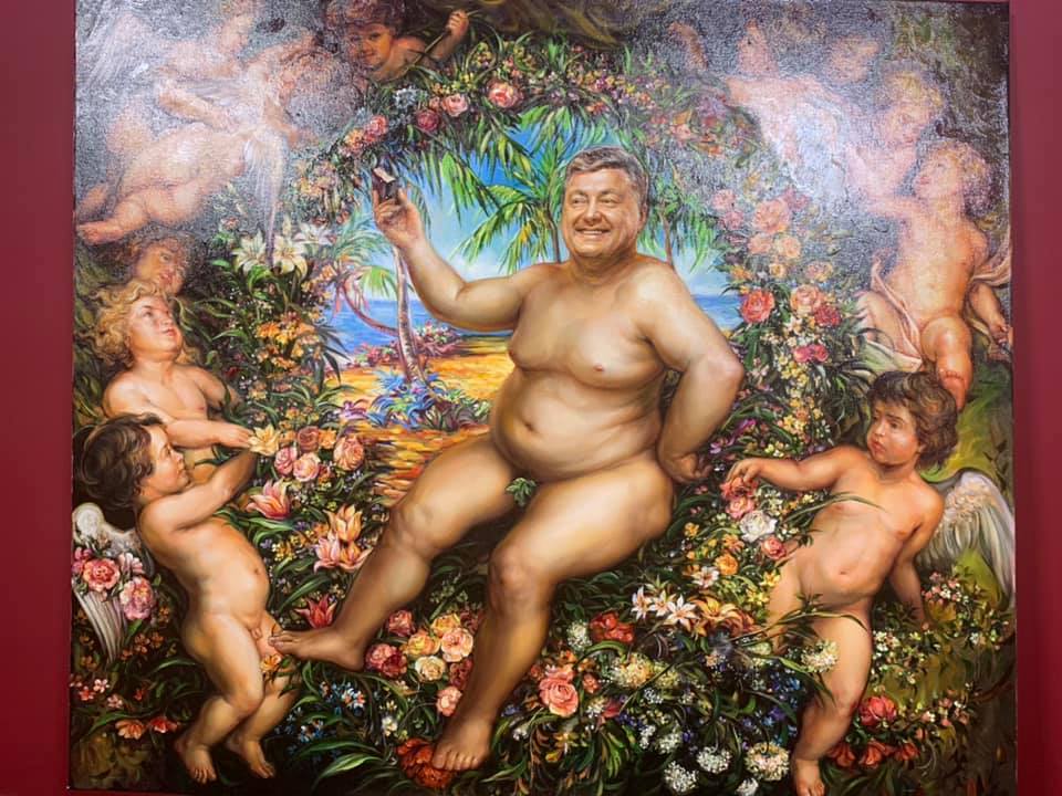 На полотне под названием "Петр уже пятый" изображен обнаженный мужчина, похожий на экс-президента Петра Порошенко в окружении ангелов на фоне пляжного пейзажа. В руке у него конфета "Птичье молоко".