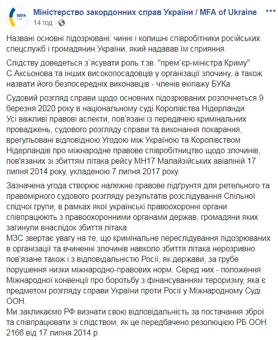 МИД обращает внимание на то, что уголовное преследование подозреваемых в организации и совершении преступления вокруг катастрофы самолета неразрывно связано также и с ответственностью России, как государства, за грубое нарушение ряда международно-правовых норм. Среди них - положение Международной конвенции о борьбе с финансированием терроризма, которое является предметом рассмотрения дела Украины против России в Международном суде ООН. Мы призываем РФ признать свою ответственность за поставки оружия и сотрудничать со следствием, как это предусмотрено резолюцией СБ ООН 2166 от 17 июля 2014 года", - заявили в МИД Украины.