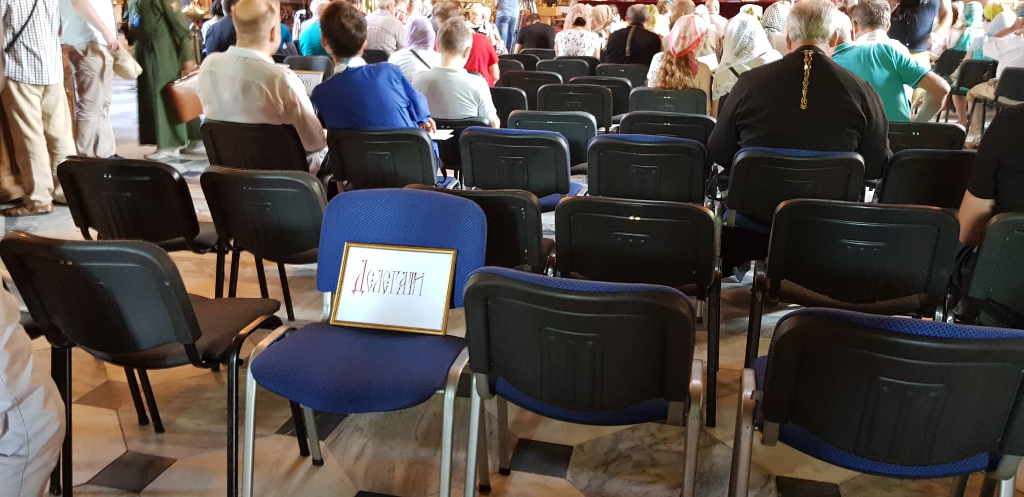 В четверг, 20 июня, в 11.00 во Владимирском Соборе начинается Поместный собор УПЦ КП. Внутри самого храма перед алтарем выставлен стол с 5 стульями, судя по всему места высшего духовенства церкви. В самом храме собралось порядка сотни человек, которые сидят в зонах "делегация" и "гости".