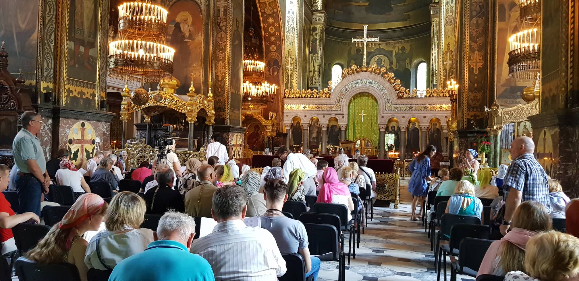 11:00 Во Владимирском Соборе начинается Поместный собор УПЦ КП. Внутри самого храма перед алтарем выставлен стол с 5 стульями, судя по всему места высшего духовенства церкви. В самом храме собралось порядка сотни человек, которые сидят в зонах "делегация" и "гости".
