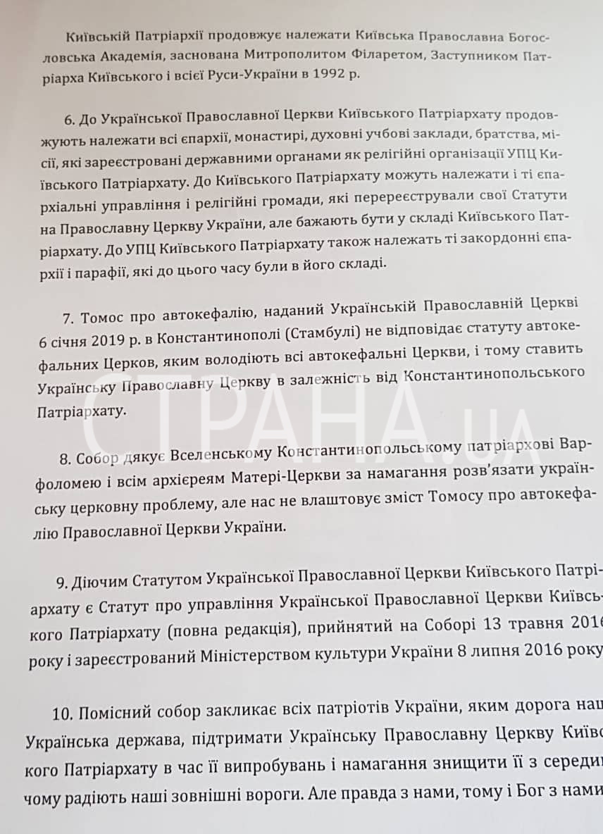 Пункт 10. Поместный собор призывает всех патриотов Украины, которым дорого наше Украинское госудаство, поддержать Украинскую Православную Церковь Киевского Патриархата во время ее испытаний и попыток уничтожить ее изнутри, чему радуются наши внешние враги. Но правда с нами, поэтому и Бог с нами.