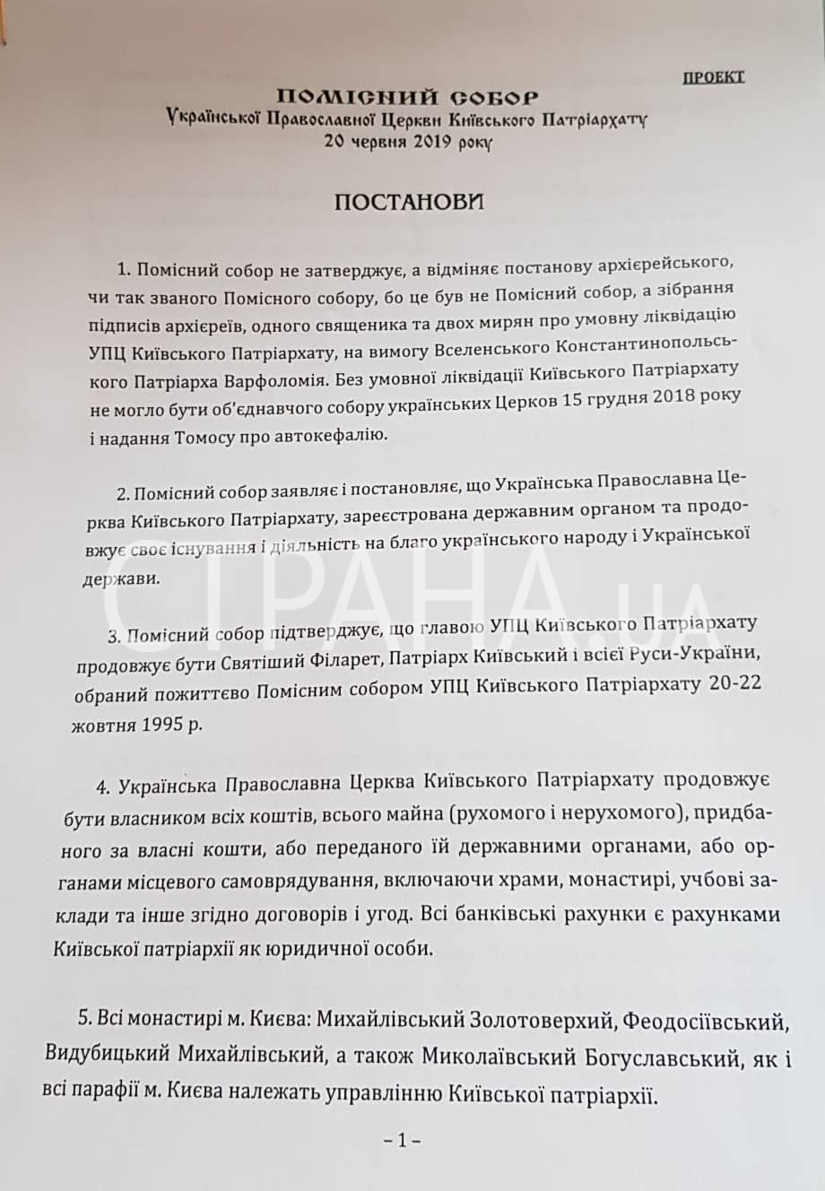 Пункт 2. Поместный собор заявляет и постановляет, что Украинская Православная Церковь Киевского Патриархата, зарегистрированна государственным органом и продолжает свое существование и деятельность на благо украинского народа и украинского государства.