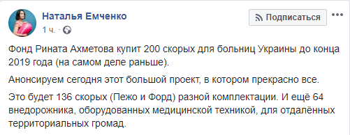 Фонд Рината Ахметова собирается закупить 200 машин скорой помощи для больниц Украины до конца 2019 года. Об этом заявила член Наблюдательного совета Фонда Наталья Емченко на своей странице в Facebook.
