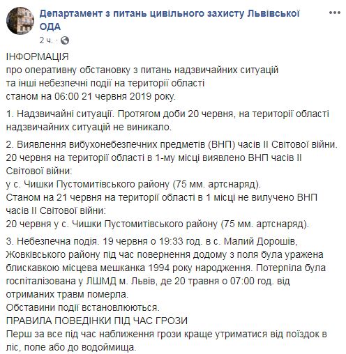 Трагедия произошла 19 июня в 19:33 в селе Малый Дорошев, Жовковского района. Местная жительница 1994 года рождения шла домой и в пути ее поразила молния.