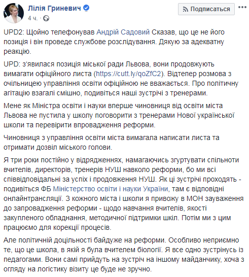 "Меня как министра образования и науки впервые чиновница от образования города Львова не пустила в школу поговорить с тренерами Новой украинской школы ("НУШ") и проверить внедрение реформы. Чиновница из управления образования города требовала написать письмо и получить разрешение городского головы", – говорится в сообщении на ее фб-странице.