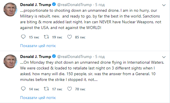 "В понедельник они сбили беспилотник, который совершал полет над международными водами. Прошлой ночью мы были в полной готовности нанести ответ по трем различным объектам, и я спросил, сколько людей погибнет. "150 человек, сэр" - был ответ генерала. За 10 минут до удара я его остановил", - написал Трамп.