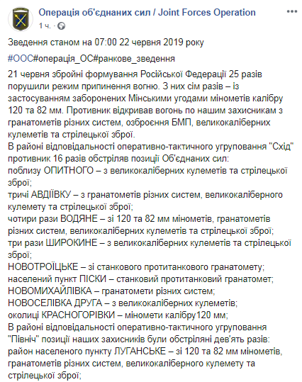 В пятницу, 21 июня, противник 25 раз нарушил режим прекращения огня на Донбассе. Из них семь раз - с применением запрещенных Минскими соглашениями минометов калибра 120 и 82 мм. Об этом сообщает пресс-центр штаба ООС на странице в Facebook.