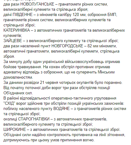 За минувшие сутки один украинский военнослужащий получил боевое травмирования. На каждый обстрел противник получил адекватный ответ по вооружению, не противоречащей Минским договоренностям. По данным разведки, 21 июня четыре противника были ранены.