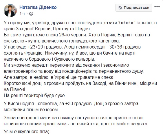 Об этом на своей странице в Facebook сообщает синоптик Наталья Диденко.