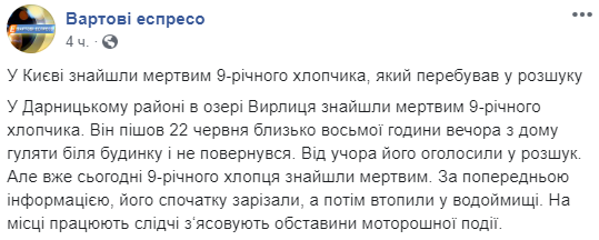 Мальчик вчера около восьми часов вечера пошел гулять возле дома, но так и не вернулся. Родители не смогли самостоятельно найти ребенка, поэтому обратились в полицию. Тогда его и объявили в розыск. Уже сегодня, 23 июня, его нашли мертвым в озере Вырлица в Дарницком районе столицы. По информации издания, ребенка сначала зарезали, а тело выбросили в озеро. На месте происшествия работают правоохранители.