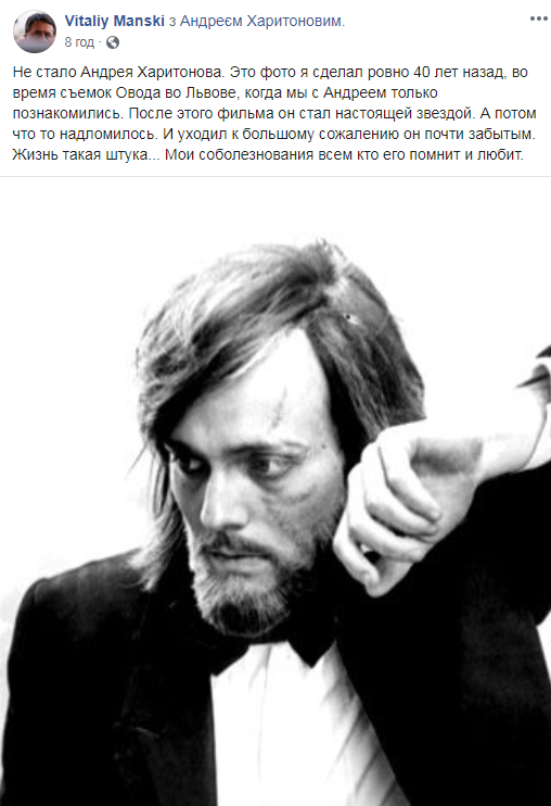 "Не стало Андрея Харитонова. Это фото я сделал ровно 40 лет назад, во время съемок Овода во Львове, когда мы с Андреем только познакомились. После этого фильма он стал настоящей звездой. А потом что-то надломилось. И уходил к большому сожалению он почти забытым. Жизнь такая штука... Мои соболезнования всем кто его помнит и любит", - написал Виталий Манский.