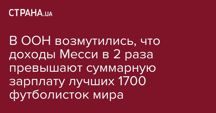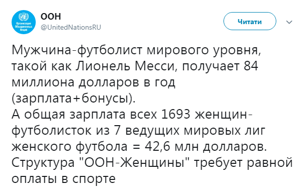 "Мужчина-футболист мирового уровня, такой как Лионель Месси, получает 84 миллиона долларов в год (зарплата+бонусы). А общая зарплата всех 1693 женщин-футболисток из 7 ведущих мировых лиг женского футбола = 42,6 млн долларов. Структура "ООН-Женщины" требует равной оплаты в спорте", - говорится в сообщении пресс-службы ООН.