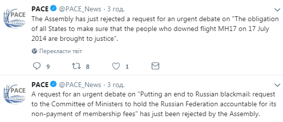 Ранее в Парламентскую ассамблею Совета Европы поступили два запроса о проведении срочных дебатов под названием "Обязанность всех государств-членов обеспечить, чтобы виновные в сбитии рейса MH17 17 июля 2014 года были привлечены к судебной ответственности" и о просьбе к Комитету министров "привлечь Российскую Федерацию к ответственности за неуплату членских взносов".