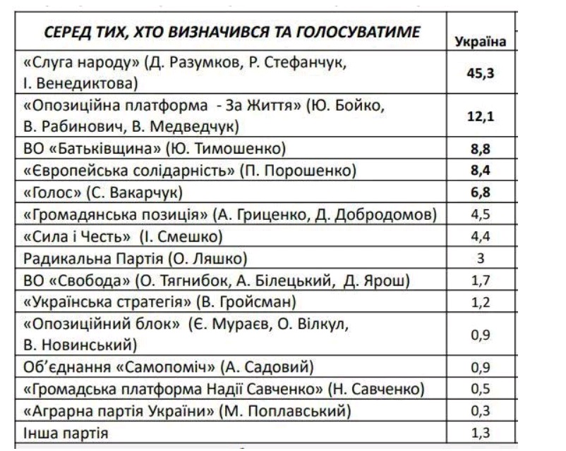 С показателем 45,3% лидирует партия "Слуга народа". Рейтинг "Оппозиционной платформы - За жизнь" составляет 12,1%. Три следующих в списке предпочтений политсилы не набирают и 10%. ВО "Батькивщина" Юлии Тимошенко намереваются поддержать 8,8% опрошенных, "Европейскую солидарность" Петра Порошенко - 8,4%, "Голос" Святослава Вакарчука - 6,8% избирателей.
