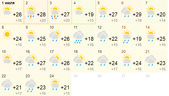 По данным Gismeteo, июль будет не таким жарким, как июнь. Максимальная температура +29. Временами +18...+20. Конец месяца будет прохладным: до +21...+23. Периодически будут идти дожди.