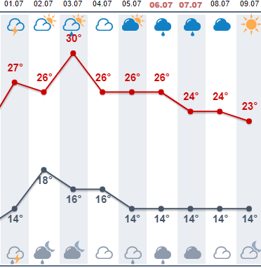 Meteoprog дал прогноз до 9 июля. Судя по нему, июль начнется с +26...+27, затем однодневный пик до +30, 3 июля, а далее станет прохладнее: +23...+26.