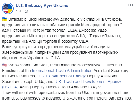 "Приветствуем в Киеве межведомственную делегацию в составе Яна Стеффи, представителя по вопросам глобальных рынков Международной торговой администрации Министерства торговли США, Джозефа Уддо, представителя Министерства энергетики США, и Тодда Абрахано, представителя Агентства торговли и развития США", - говорится в сообщении, опубликованном в понедельник вечером на странице американского посольства в Украине в соцсети Фейсбук.