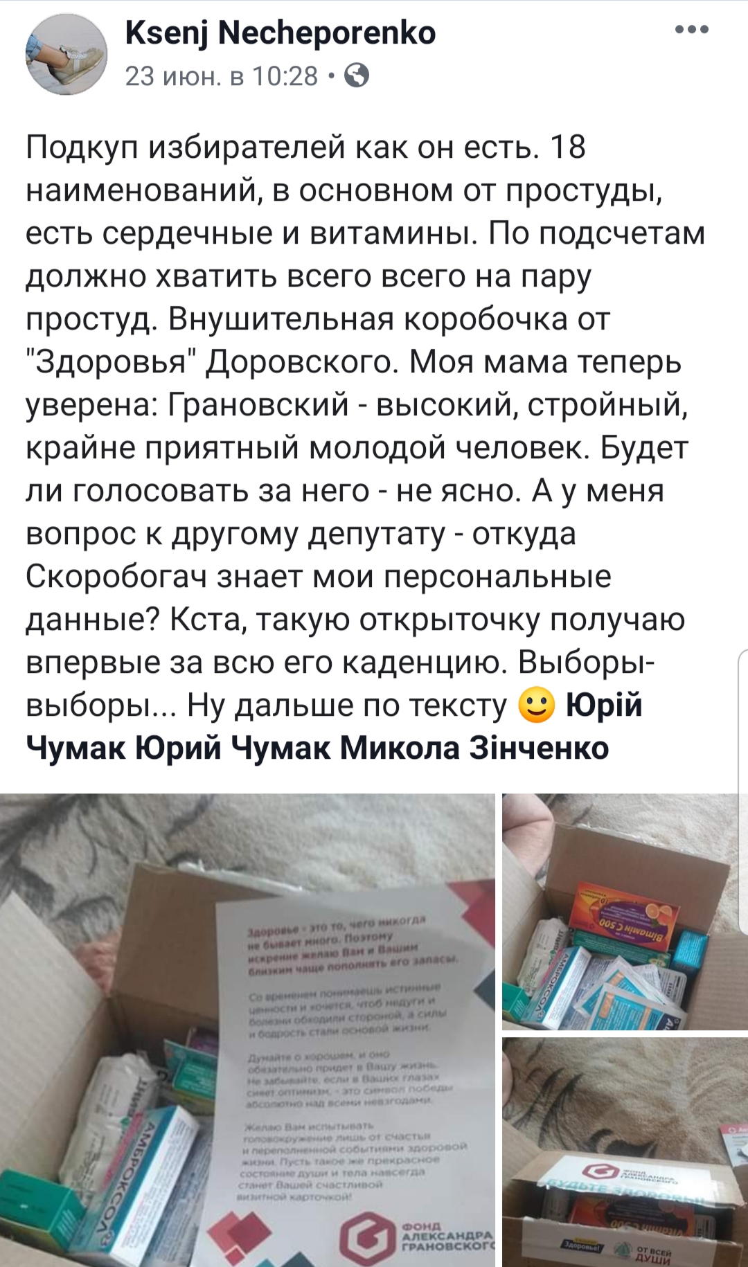 "Подкуп избирателей как он есть. 18 наименований, в основном от простуды, есть сердечные и витамины. По подсчетам должно хватить всего на пару простуд. Внушительная коробочка от "Здоровья" Доровского (фармкомпания "Здоровье" харьковчанина Александра Доровского - ред.). Моя мама теперь уверена: Грановский - высокий, стройный, крайне приятный молодой человек. Будет ли голосовать за него - неясно", - пишет жительница Харькова Ксения Нечипоренко.