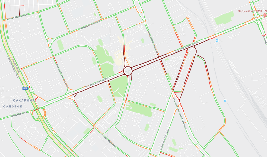 По данным сервиса Google Maps, проспект Леся Курбаса практически парализован. "Стоят" также соседние улицы Семьи Сосниных и Пшеничная.