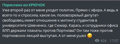 "Уже второй раз от меня уходит политик. Прямо с эфира. А ведь я всего-то и спросила, какое он, половозрелый депутат-свободовец имеет отношение к митингу студентов в университете Шевченко, где Сюмар, Карась и сотрудники офиса БПП держали плакаты против Портнова? Он там тоже против портновских лекций выступал. А от меня ушел", - говорит она.