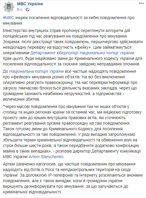 "Из-за массовых сообщений о минировании тех или иных объектов в столице и других регионах страны за последнее время, мы инициируем подготовку проекта изменений в наших внутренних правовых актах, которые уточняют регламент реагирования органов правопорядка на такие сообщения. Также готовим изменения в Уголовный кодекс для усиления ответственности за такие сообщения. В ряде случаев предложим увеличить срок уголовной ответственности и ограничения свободы на срок более 6-ти лет, а также предусмотреть дополнительно конфискацию имущества в таких случаях", - рассказал директор департамента коммуникации МВД Украины Артем Шевченко.