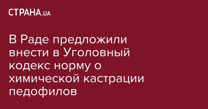 Напомним, что Раду обязали рассмотреть вопрос о внедрении в Украине кастрации педофилов. Петиция относительно рассмотрения данного проекта собрала более чем 28 000 голосов из 25 000 необходимых. Профильный комитет еще не ответил на нее, так как сбор подписей будет длиться еще 63 дня. После 27 августа ответ будет размещен в разделе "Закончился срок".