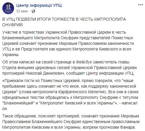Участие в торжествах УПЦ МП в честь митрополита Онуфрия представителей поместных церквей означает признание мировым православием каноничности УПЦ и ее предстоятеля как единого митрополита Киевского и всея Украины. Об этом пишет Центр информации УПЦ в Facebook со ссылкой на заместителя главы отдела внешних церковных связей УПЦ МП протоиерея Николай Данилевича.