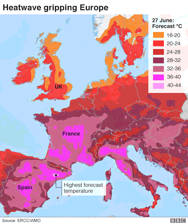 Сегодня же, 27 июня, в ряде стран, в том числе во Франции и Швейцарии, температура поднимется выше +40 градусов Цельсия. Метеорологи утверждают, что жара в Европе вызвана горячим воздухом из северной Африки,из пустыни Сахара.