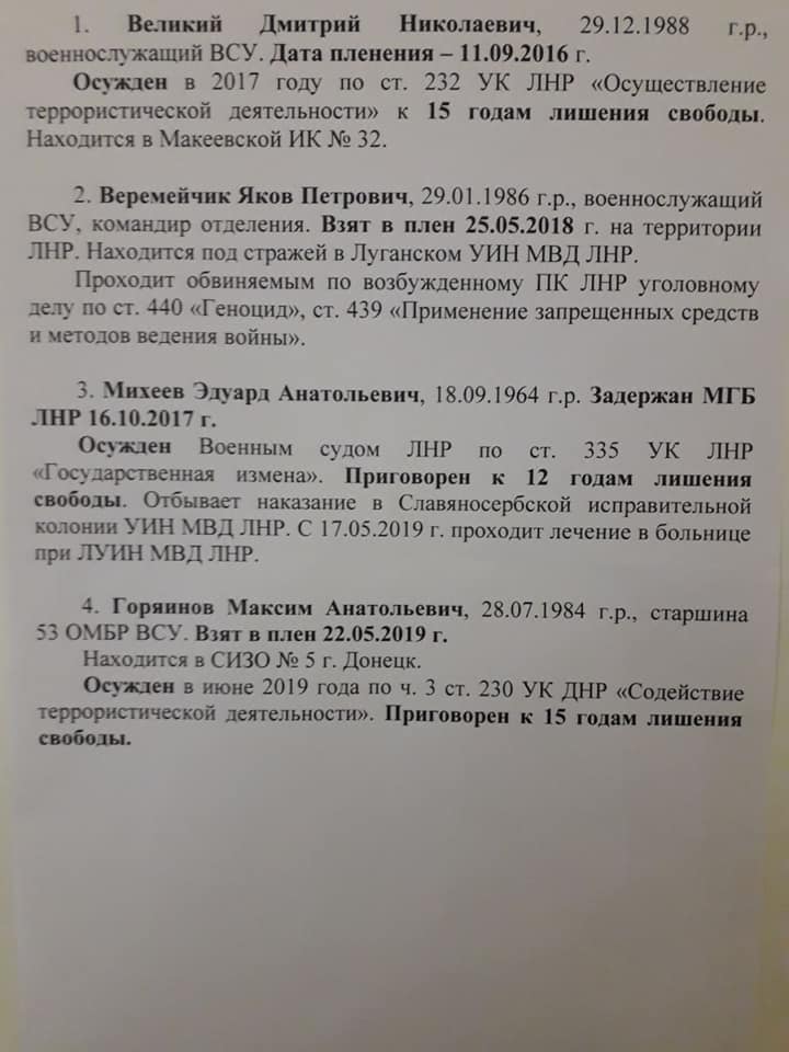 В списке четыре человека: Яков Веремейчик, Эдуард Михеев, Максим Гориянов, Дмитрий Великий. Яков Веремейчик был обвинен сепаратистами «в применении запрещенных методов ведения войны». Эдуард Михеев осужден в непризнанной "ЛНР" к 12 годам за "государственную измену". Максим Горяинов осужден в т. н. "ДНР" к 15 годам за содействие "террористической деятельности". Дмитрий Великий был осужден к 15 годам за "террористическую деятельность".