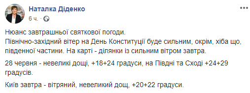 28 июня - небольшие дожди, + 18 + 24 градуса, на юге и востоке + 24 + 29 градусов. Киев завтра - ветреный, небольшой дождь, + 20 + 22 градуса", - написала Наталья Диденко на своей странице в соцсети.