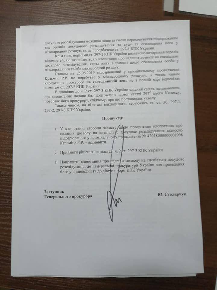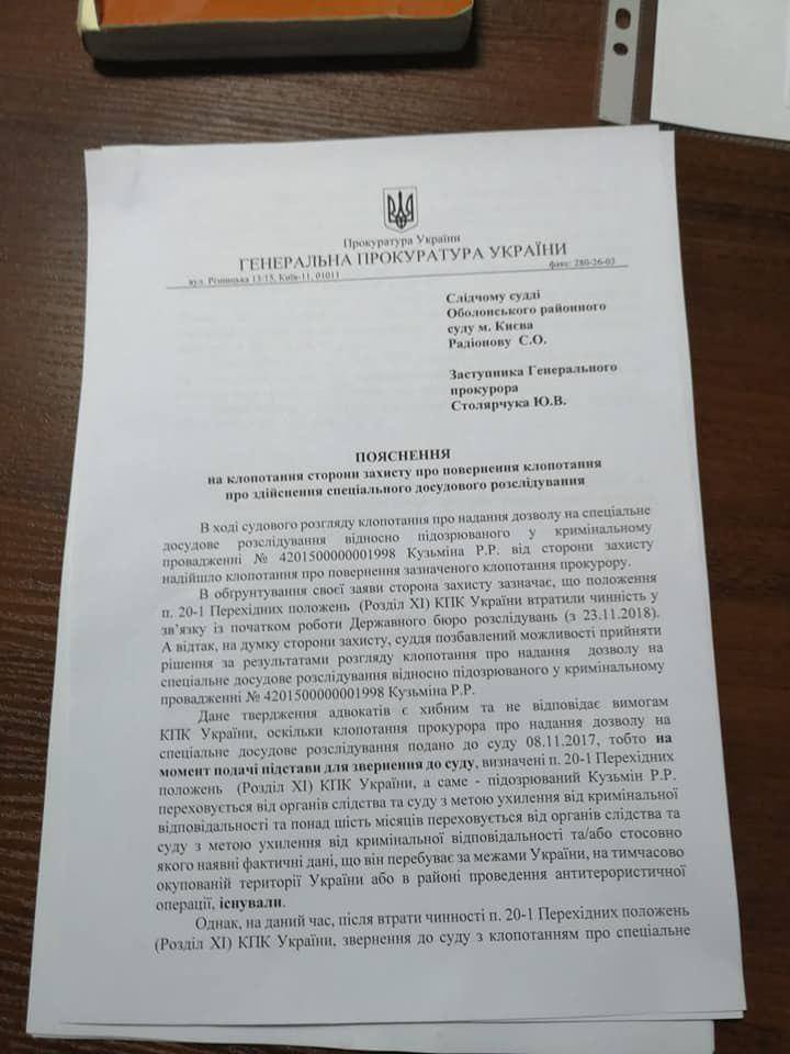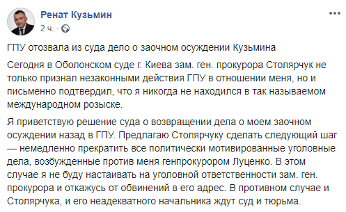В четверг, 17 июня, в Оболонском суде Киева заместитель генпрокурора Юрий Столярчук признал незаконными действия Генпрокуратуры в отношении бывшего заместителя секретаря СНБО Рената Кузьмина, а также письменно подтвердил, что тот никогда не находился в международном розыске. Об этом Кузьмин сообщил на своей странице в Facebook в четверг вечером.